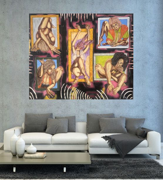 Each body bends within a frame — representing the fragmented self, hidden desires, and the limits imposed by society.